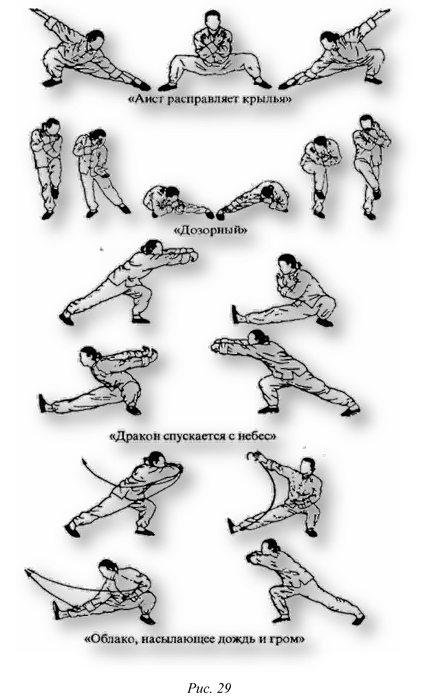 Следует помнить: СУСТАВЫ РАСТЯГИВАТЬ НЕЛЬЗЯ. Удлиняться должны мышцы. Процесс этот достаточно долгий, и форсировать его ни в коем случае нельзя. В бою важна не та растяжка, которую вы можете показать, а та, которую вы сможете использовать. Излишняя растяжка может быть даже вредной — так, например, чрезмерное усердие в перегибании колен против или поперек естественного сгиба приводит к сильным болям в суставах и к повышенной опасности вывихов и переломов этого наиболее сложного соединительного звена в человеческом организме. Поэтому не стоит работать на количество, следуя принципу «еще разик», — это не тренирует, а разрушает сустав. Лучше действовать медленно, сводя количество повторений до минимума и выполняя растягивания за счет собственных мышц самой конечности, а не за счет своего веса или веса партнера (рис. 29).