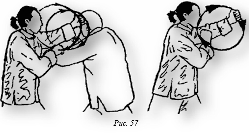 Так, основным примером подобного использования вертикального круга может служить техника «обезьяна лезет на дерево», или, как ее часто называют ученики, «циркулярка». Это чрезвычайно эффективное действие представляет собой одновременное выполнение обеими руками вертикальных кругов вдоль линии боя, причем руки в этот момент движутся в противофазе по среднему кругу. Противник как бы подминается под себя градом ударов локтей и кулаков «куда ни попадя». Особенно эффективно используется этот прием против рывково-тычковой техники, принятой в каратэ, попросту ошеломляя противника, начисто лишая его желания продолжать бой (рис. 57).