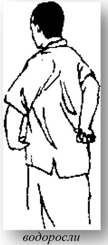 3.«Водоросли» Ноги расставлены на 1,5 ширины плеч, руки висят вдоль тела. Они подобны водорослям, зацепившимся за воткнутую в дно жердь. Перенося вес с одной ноги на другую, вы начинаем раскачиваться, слегка скручиваясь вокруг продольной оси, и водоросли мягко и плавно «тянутся» за движениями в которых нет ни малейшего напряжения. Переход одного в другое происходит без малейшей задержки, плавно и незаметно. Руки еще движутся направо, когда тело уже разворачивается влево, и наоборот. Момент перемены направления очень краток - и в этот миг происходит вдох, за которым следует медленный выдох - движения рук.