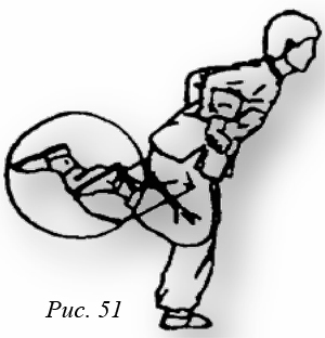 6. «Боковой велосипед». Работа по вертикальному кругу в сторону. Никаких особенных примечаний, кроме того, что ступня опорной ноги чуть разворачивается наружу. Следите за правильностью круга и безрывковым движением (рис. 50).