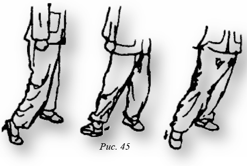1. Круг описывается кончиками пальцев ноги. Упражнение укрепляет икроножные мышцы и дает возможность использовать их силу в прыжках и ударах. Такой же круг можно выполнить пяткой.Выполняя круги, следите чтобы соседние суставы как можно меньше «лезли не в свое дело». Работайте конкретным суставом — тогда будет гораздо больше толку (рис. 44, 45).