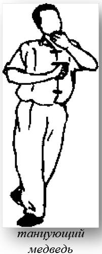 4.«Танцующий медведь» Ноги скрещены, пятка одной ноги как можно плотнее прижата к носку другой. Руки «подвешены» перед грудью. Переваливаясь с ноги на ногу, медленно поворачивайтесь вокруг своей оси, раскачиваясь всем телом. Руки в расслаблении колеблются перед грудью. Дыхание в такт шагов, взгляд рассосредоточен.