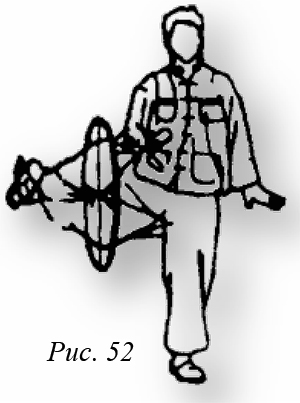 8. Вращение колена. Здесь движение весьма своеобразно: старайтесь не двигать ни голеностопным, ни тазобедренными суставами — то есть, вращать ими можно, но сдвигать с первоначального места нельзя (рис. 52).