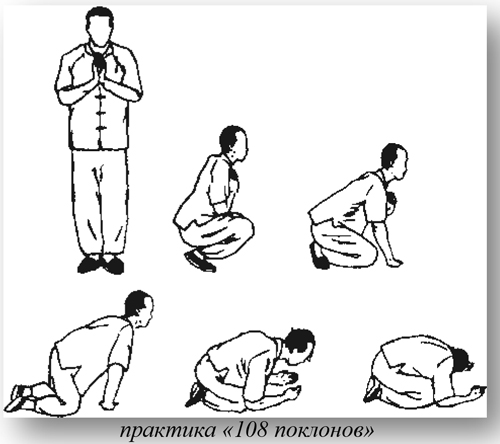 Приступая к тренировке, вы выполняете поклоны, символизирующие почтение ко всем Буддам Трех Миров — прошлого, настоящего и будущего, почтение ко всей Вселенной, которую символизирует число 108 — «число бесконечности» - все рисунки; кроме первого, дают вид сбоку.