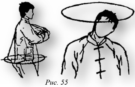 | КРУГИ ТАЗОМ И ГОЛОВОЙ Выполняя круги руками, продвинутые ученики зачастую соединяют их с кругами головой и тазом (рис. 55), что потом, в бою, дает потрясающий эффект в виде уклонов и уходов. Навык удерживания в сознании сразу нескольких центров внимания очень облегчает потом работу с несколькими противниками.