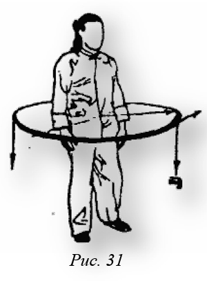 Первый круг — круг «пояса» — еще носит название круга «энергии». Это объясняется тем, что совершая движение этого типа, мы практически не испытываем противодействие силы тяжести, поскольку ее воздействие на всей траектории движения направлено в одну и ту же сторону и ее работа равна нулю (рис. 31).
