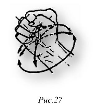Чтобы избежать таких ошибок, необходимо разбить движения на составляющие, достаточно мелкие и универсальные, чтобы с помощью их комбинаций возможно было получить любую форму движения. Умея моделировать движения, мы сможем легко их распознавать и находить наилучшие варианты контроля и противодействия. Эти составляющие детали называются «элементами». Как правило, они представляют собой простейший сгиб-разгиб или круговое движение в каком либо суставе. Всякий сустав имеет от одной до 3-х степеней свободы (рис. 27).