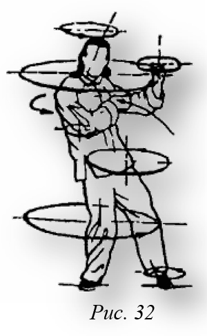 | Выполнение движения одного и того же типа на кругах разного размера ведет к качественному изменению техники. Эти три основных размера позволяют совмещать одновременное выполнение различных кругов в процессе выполнения техник (рис. 40, 41).
