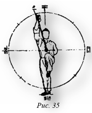| Круг щита Замыкает все круг «щита» или круг тела, который дает возможность уверенно управлять любым перемещением энергии в пространстве тела, которое определяется как сфера, центром которой является точка в районе солнечного сплетения, а радиус соответствует расстоянию, на которое данный человек может дотянуться кончиком пальца (рис. 35).